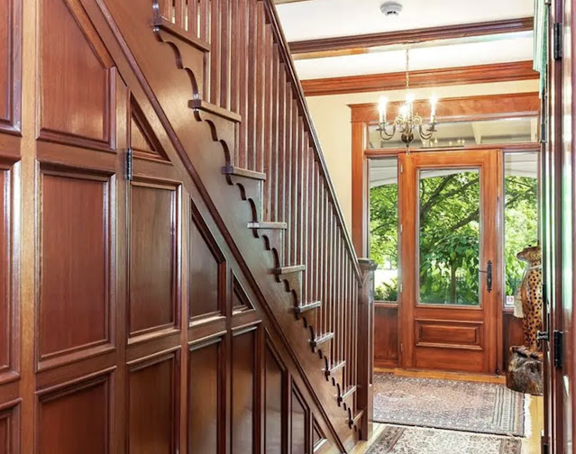 The family room is paneled in rosewood. There's a secret staircase behind one of the bookcases, just like in a cozy English mystery novel. It leads to one of the bedrooms. Also, the fireplace in here supposedly bears the Prime family's coat of arms: