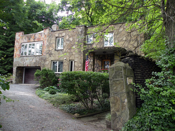 Yes, this started life as a chicken coop. He named it Heidelberg, after his birthplace in Germany. It has concrete floors and interior stone walls (and no more pictures online). It was always intended to be a rental unit, so it was divided into three apartments. It has no stairways; instead he built it so that each floor was level with the slope of the ground and could be accessed separately.